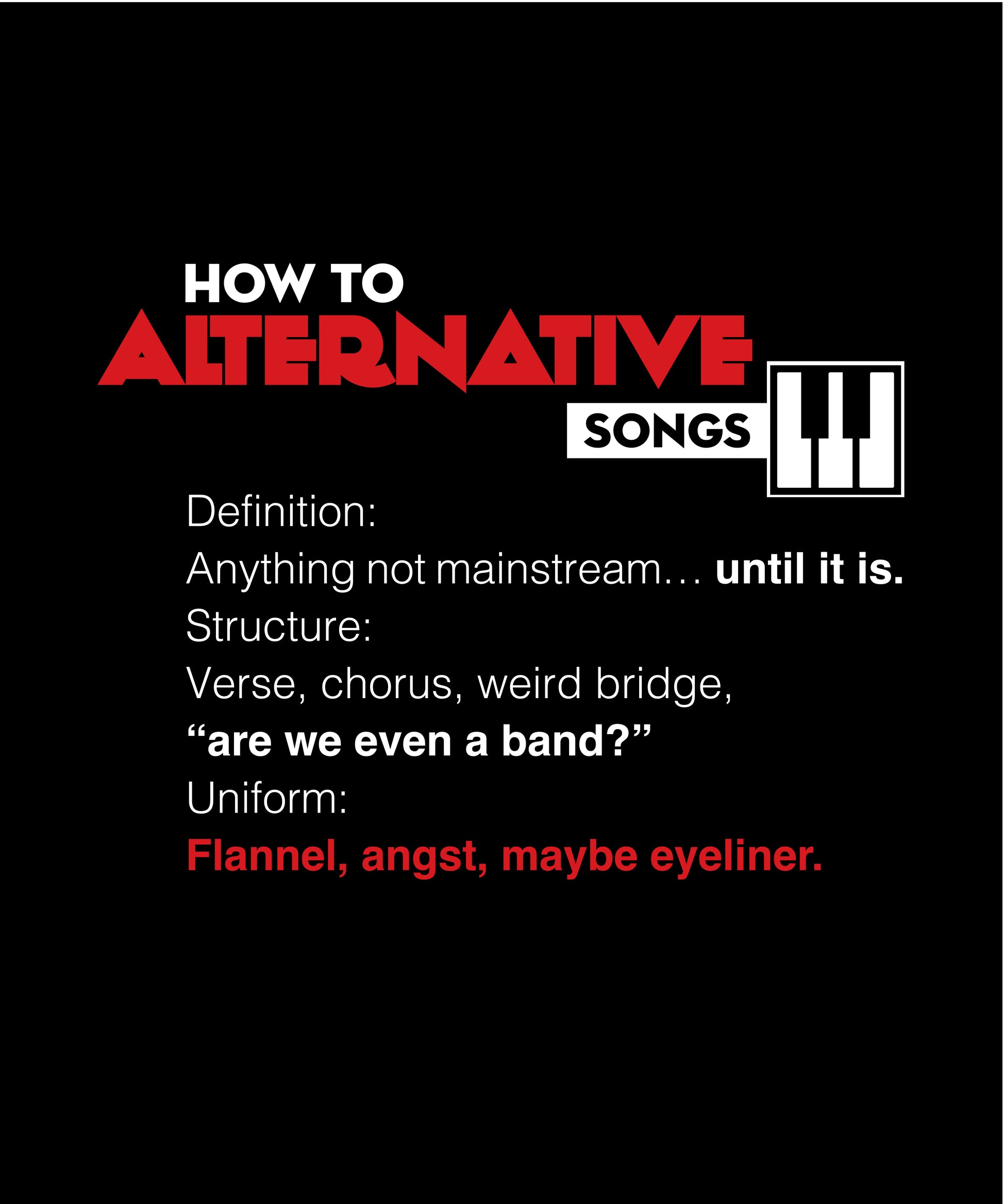 An ironic tribute to alt rock—full of angst, weird bridges, and identity confusion. For those who still wear flannel and maybe eyeliner.
