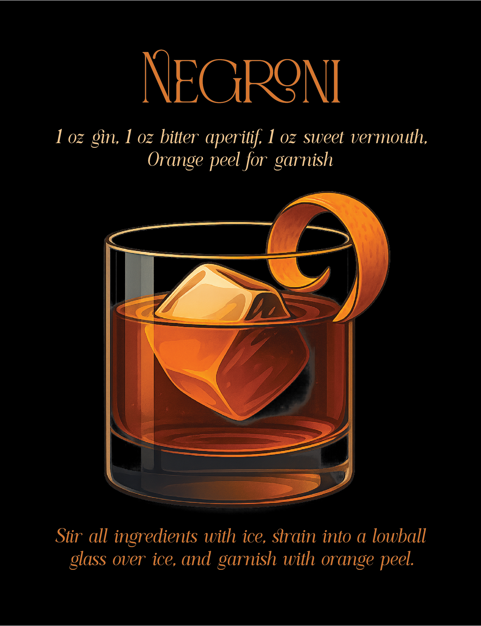 This piece celebrates the timeless elegance of the Negroni—a cocktail with a bold flavor and iconic simplicity. I wanted to capture not just the drink, but the ritual behind it: the clink of ice, the citrus twist, and the quiet sophistication of a well-made classic. Perfect for home bars and cocktail lovers who appreciate vintage charm and mixology culture.