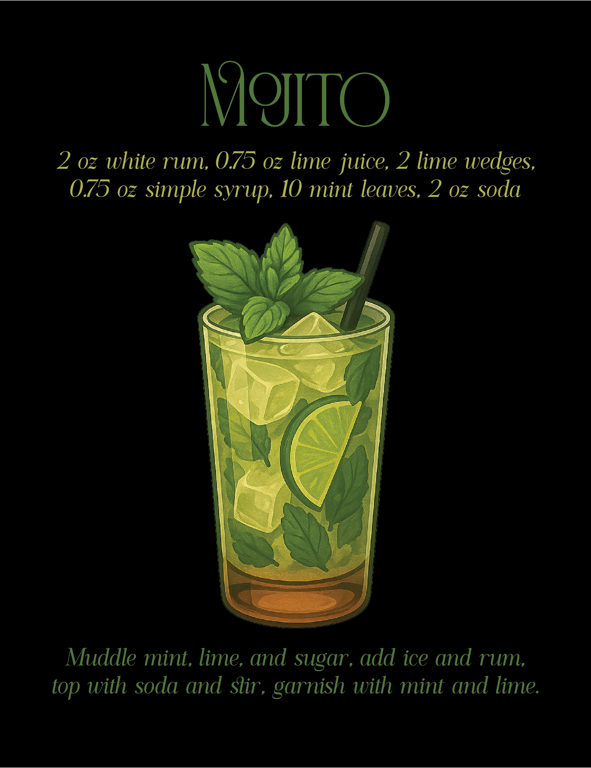 This artwork captures the vibrant spirit of the Mojito—a refreshing Cuban classic bursting with mint, lime, and sunshine. It’s a celebration of warm days, cool drinks, and effortless charm, perfect for anyone who loves tropical flavors and bright, cheerful design.