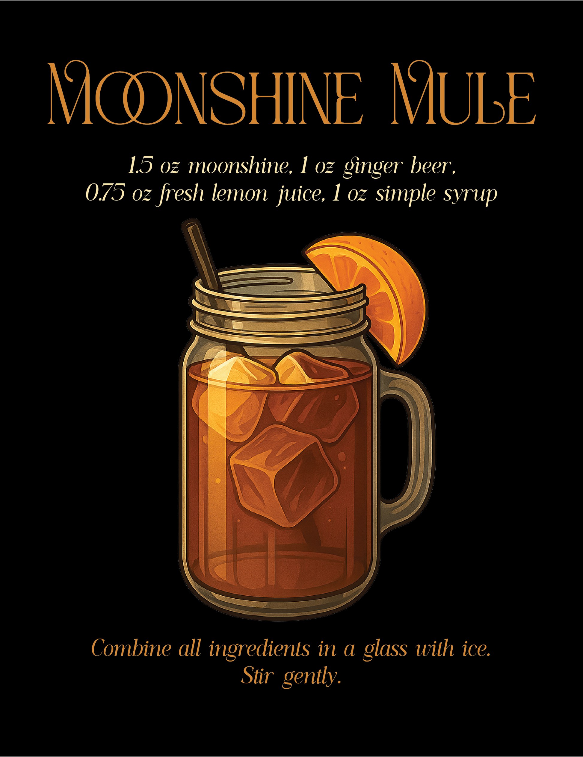 This piece is a tribute to the bold, rustic charm of the Moonshine Mule. Inspired by Southern flair and homemade tradition, the illustration captures the warmth of mason jars, zesty citrus, and strong spirits. Designed for cocktail enthusiasts who love a little edge in their glass and a lot of character in their decor.