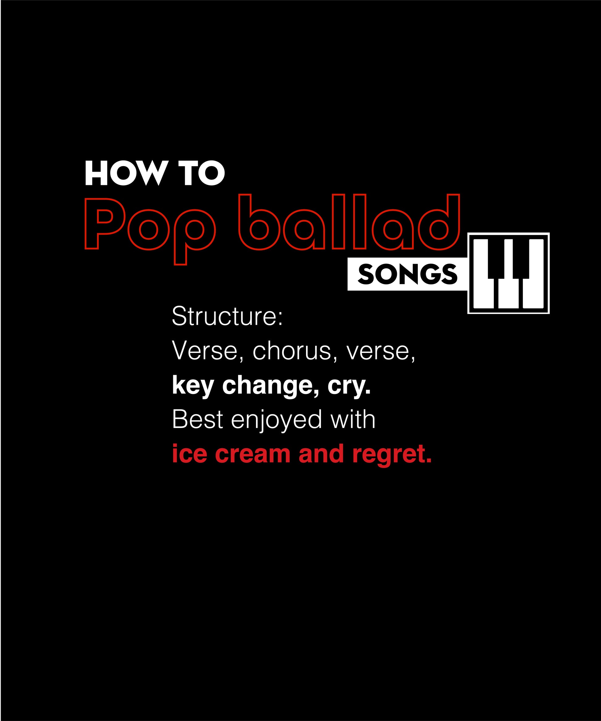 A cheeky breakdown of every pop ballad ever—complete with key changes and emotional breakdowns. Best served with ice cream and regrets.