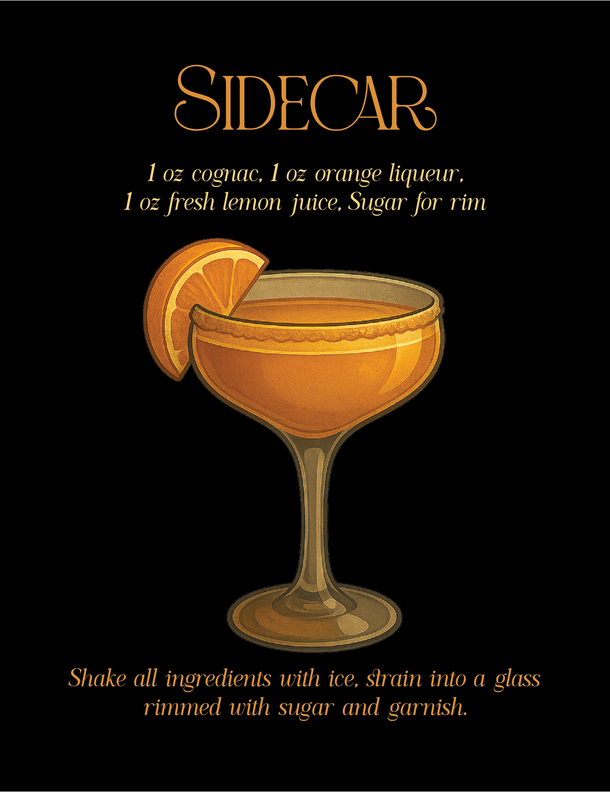 This piece celebrates the Sidecar—a cocktail that’s citrusy, classy, and full of charm. With its sugared rim and golden glow, it evokes vintage Parisian bars and refined flavors. Perfect for those who love timeless cocktails with a zesty twist and elegant presentation.