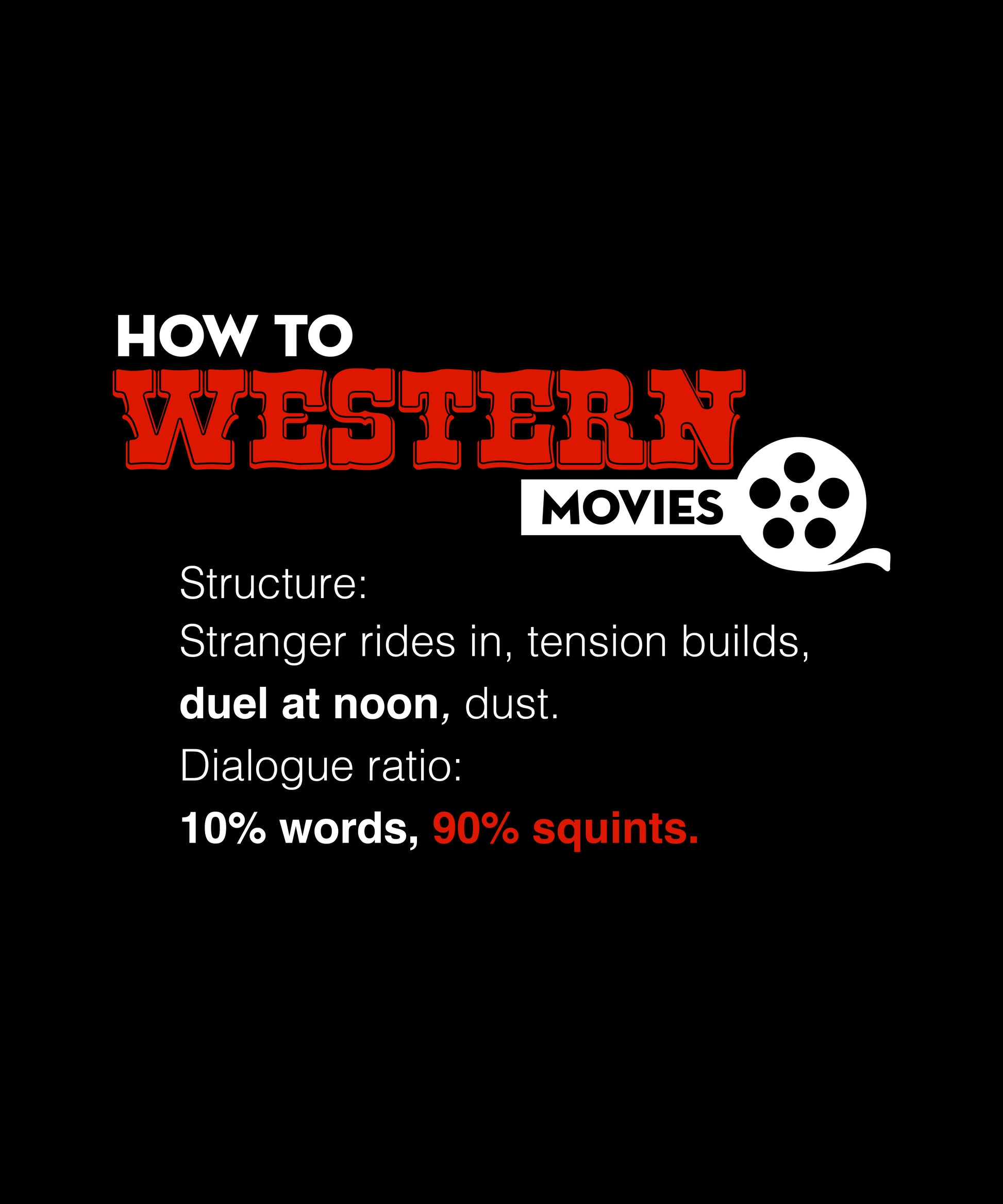 All Westerns in a line: 90% squinting. A dry, dusty wink at cowboy classics and silent stares before gunfights.
